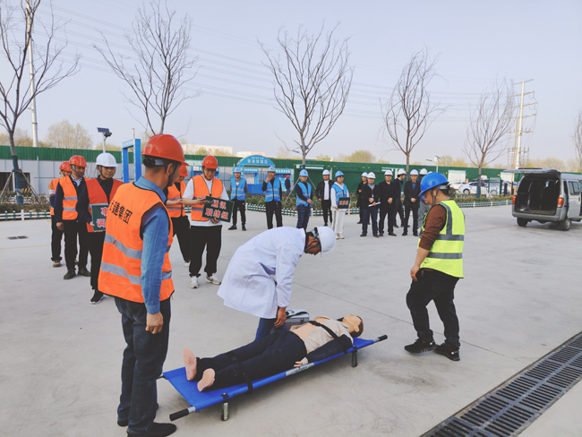 本次演練共分6個(gè)小組,分別為:現(xiàn)場(chǎng)模擬組、現(xiàn)場(chǎng)警戒(搶修)組、應(yīng)急救援(疏散)組、通訊聯(lián)絡(luò)組、事故調(diào)查組、 觀摩組。假設(shè)工人在生活區(qū)違規(guī)使用大功率電器突發(fā)火災(zāi),被煙霧和火勢(shì)圍困,二樓有人發(fā)出救援信號(hào),正在附近巡查的安全員發(fā)現(xiàn)情況后,立即趕赴現(xiàn)場(chǎng)并打電話給項(xiàng)目生產(chǎn)負(fù)責(zé)人,在接到通知后,項(xiàng)目生產(chǎn)負(fù)責(zé)人迅速安排項(xiàng)目部應(yīng)急救援辦公室負(fù)責(zé)人,并啟動(dòng)應(yīng)急預(yù)案,各救援小組立即到達(dá)現(xiàn)場(chǎng)開展工作,安全員迅速引導(dǎo)全體人員有序從疏散樓梯疏散到安全位置,救援組帶著擔(dān)架、急救箱等趕赴現(xiàn)場(chǎng),將“受傷”人員用擔(dān)架從房?jī)?nèi)撤離到安全位置,同時(shí)救援醫(yī)生對(duì)“受傷”人員進(jìn)行簡(jiǎn)單的心肺復(fù)蘇、人工呼吸,并迅速送往醫(yī)院進(jìn)行治療。