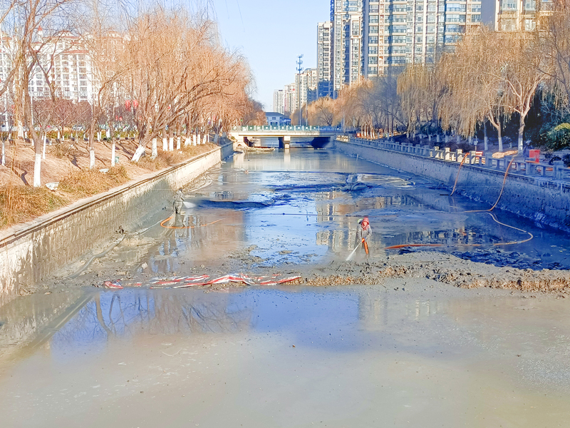 園區(qū)利民河全長1.1公里、寬20米,為區(qū)內(nèi)景觀河。經(jīng)前期摸排,河道內(nèi)淤泥沉積較多,影響河道自凈能力。城發(fā)公司克服冬季氣溫低、斷面長、施工難等不利因素,采用泥漿泵配合高壓水槍射水,管道封閉運輸?shù)氖┕し椒?,清理淤泥約8500立方米,高效完成河道清淤工作。