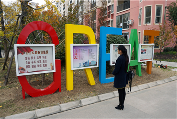 紅黃藍綠橙,多彩的字母組成英文單詞“GREAT”,中間鑲嵌四個方形宣傳框,今年社區(qū)在明日星城和恒大綠洲小區(qū)試點放置兩個宣傳欄。居民看著社區(qū)移走小區(qū)大門口的多個移動立牌,放置這樣的宣傳欄紛紛點贊。這次設(shè)立“GREAT”立體廣告牌,不僅美化了小區(qū)環(huán)境,走起了國際范,還有著特殊的意義,“GREAT”具有美好向上的意思,社區(qū)希望提倡積極生活、追求美好的社區(qū)文化。