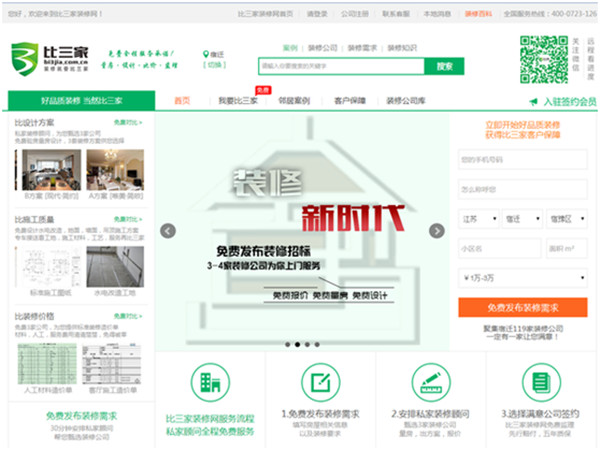 比三家裝修網(wǎng)于2015年10月份落戶蘇宿電子商務產(chǎn)業(yè)園,該裝修網(wǎng)定位于“互聯(lián)網(wǎng)+”大眾創(chuàng)業(yè)平臺,是一家扎根于三線城市,以“中介生意”模式幫助傳統(tǒng)的裝修行業(yè)的公司利用互聯(lián)網(wǎng)接到更多的訂單,幫助用戶找到合適的裝修公司。網(wǎng)站通過好品質裝修,比設計方案、比施工質量、比裝修價格,為用戶提供符合比三家裝修網(wǎng)標準的服務。